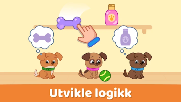 Dykk ned i en rekke engasjerende aktiviteter som skjerper konsentrasjonen og hukommelsen. Bli kjent med sjarmerende husdyr gjennom enkle 4-brikkers puslespill, hvor de store brikkene gjør det enkelt for små hender å manipulere. Utforsk kjøkkenet med morsomme størrelsesmatcher der grønnsaker som gulrøtter og gresskar skal finne riktig potte. Mestre farger gjennom sorteringsspill – enten ved å matche romvenner med taxier eller sortere resirkulerbart avfall – en intuitiv tilnærming til grunnleggende logikk. Tall fra 1 til 9 blir lekende lett å lære ved å servere mat i bakeriet eller hjelpe til på Safari-toget, med diskrete hint som veileder når det trengs.